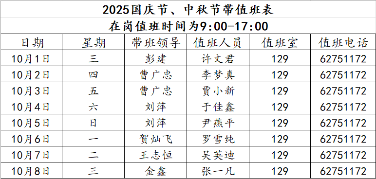 根據(jù)學(xué)校要求,10月1日至8日,學(xué)院每日安排1位工作人員在崗值班,值班地點(diǎn):129值班室,值班時(shí)間:9:00-17:00。同時(shí)每日安排1位帶班領(lǐng)導(dǎo),帶班時(shí)間9:00-次日9:00,要求帶班領(lǐng)導(dǎo)在京保持通訊暢通并能及時(shí)返校。