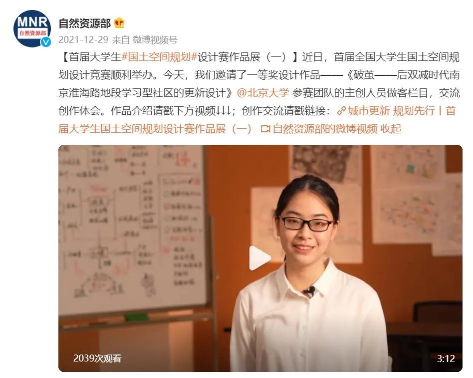 此外,作為組長,她于2021年暑假參加了自然資源部主辦的首屆全國大學生國土空間規(guī)劃設(shè)計競賽,在學院四位老師的指導下,帶領(lǐng)團隊完成了較為滿意的成果,《破繭——后雙減時代南京淮海路地段學習型社區(qū)的更新設(shè)計》獲得了全國唯二的一等獎。設(shè)計作品和創(chuàng)作歷程獲得了自然資源部相關(guān)部門采訪,在自然資源部官方微博、微信平臺及中國自然資源報上發(fā)表。