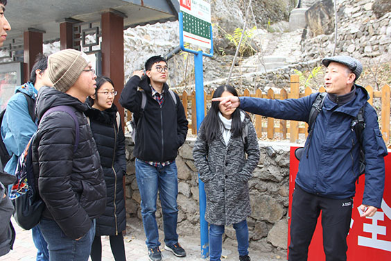 在參觀完特色建筑之后,同學(xué)們自發(fā)前往金蟾山的觀景平臺。一路上都是陡峭的山路,沒有護欄的保護,同學(xué)們彼此鼓勵,相互扶持,最終成功登頂,一覽全景。此刻正值初冬,爨底下村顯得草木蕭瑟,山土貧瘠,仿佛是一個縮小版的黃土高原。支部中有很多環(huán)境專業(yè)出身的同學(xué),就爨底下村的生態(tài)環(huán)境現(xiàn)狀展開了討論。古村群山環(huán)抱,空氣濕潤清新,相比正籠罩在嚴(yán)重霧霾中的城市,爨底下村猶如一個世外桃源。但是整個村落的植被覆蓋度比較低,十分荒涼,大片的土地可以被開發(fā)利用,栽種植物,推動整個村落生態(tài)環(huán)境的優(yōu)化。此外水土保持也是一個值得關(guān)注的問題,古村處于環(huán)山的地理位置,如果不重視水土保持,突發(fā)暴雨時容易造成山體滑坡、泥石流等災(zāi)害,危害居民的人身安全。