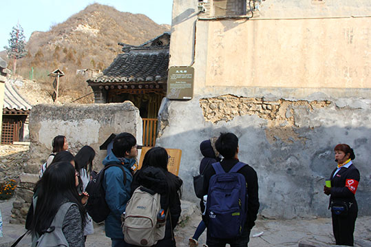 正式開始調(diào)研考察,講解員帶領(lǐng)同學(xué)們一邊參觀,一邊詳細介紹爨底下村的歷史文化背景。爨底下村的形成始于明朝加強邊境防守的需要,位于一道軍事隘口——爨里口之下,是我國首次發(fā)現(xiàn)的保留比較完整的山村古建筑群,擁有巨大的遺產(chǎn)價值。整個村落建于緩坡之上,層層升高,依山而建,以村后龍頭為圓心,南北為軸線呈扇面形展于兩側(cè),使全村形不散而神更聚,三條通道慣穿上下,而更具防洪、防匪之功能,充分體現(xiàn)人、建筑與環(huán)境的完美結(jié)合。