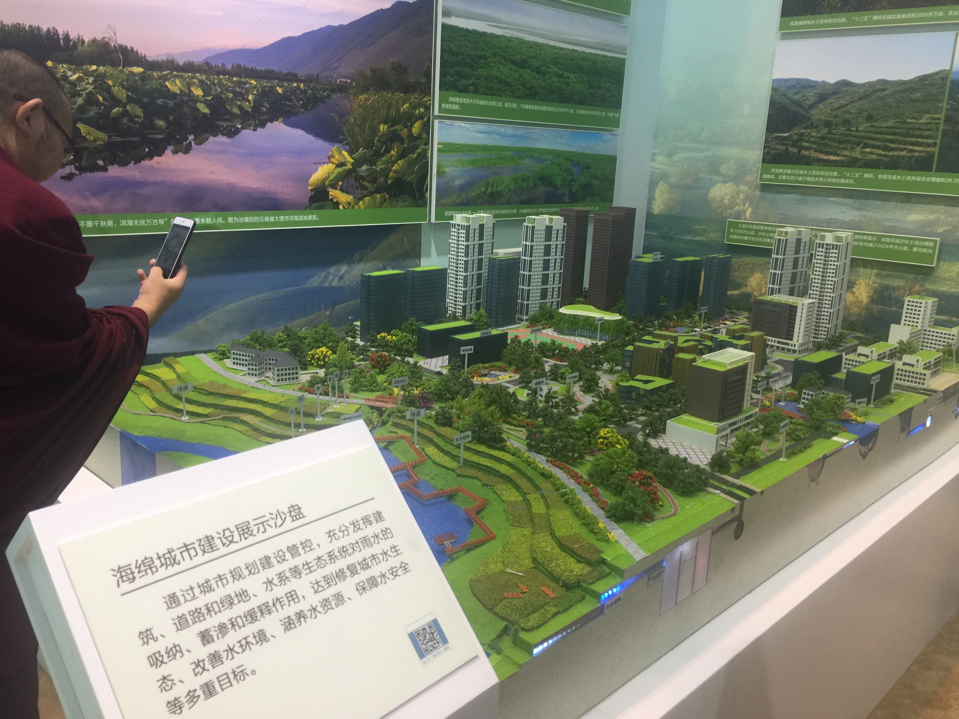 身為城市規(guī)劃專業(yè)方向的學(xué)生,在眾多展區(qū)中,我們最關(guān)注的是與城市發(fā)展相關(guān)的內(nèi)容。在生態(tài)文明展區(qū)中,有一個(gè)關(guān)于海綿城市建設(shè)的展示沙盤非常醒目。在景觀課上,我們學(xué)到許多與海綿城市相關(guān)的專業(yè)知識(shí),比如源頭處理、終端處理等對(duì)策,植草溝、雨水花園、干井、下滲地磚、綠色屋頂?shù)壬鷳B(tài)手法。這些都在這塊沙盤上一一呈現(xiàn),勾畫出一個(gè)耦合雨洪管理與游憩需求,能實(shí)現(xiàn)修復(fù)城市水生態(tài)、改善水環(huán)境、涵養(yǎng)水資源、保障水安全等目標(biāo)的城市。