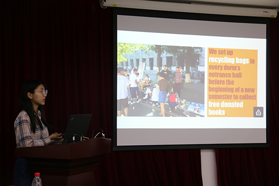 隨后,學(xué)院學(xué)生代表張志皓同學(xué)(中國(guó)大學(xué)生環(huán)境教育基地志愿者)介紹了“林歌”項(xiàng)目在校園廢紙、軍訓(xùn)衣物回收等方面所做的主要工作;童培峰同學(xué)(本科生科研學(xué)生代表)介紹了學(xué)院在本科生科研教學(xué)工作的培養(yǎng)項(xiàng)目和學(xué)術(shù)研究成果。