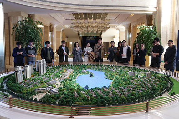 最后,同學們參觀了華夏幸福最近布局的孔雀城·大湖地產(chǎn)項目,該項目在規(guī)劃之初就在城市配套方面十分注重。售樓處的工作人員帶領大家參觀了大湖內(nèi)合院的樣板間。地上兩層地下兩層外加巨型小花園的合院,內(nèi)部精巧的設計、豪華的裝修都令大家大開眼界,其中運用的很多思路對同樣學習過設計課程的大家也有所啟發(fā)。