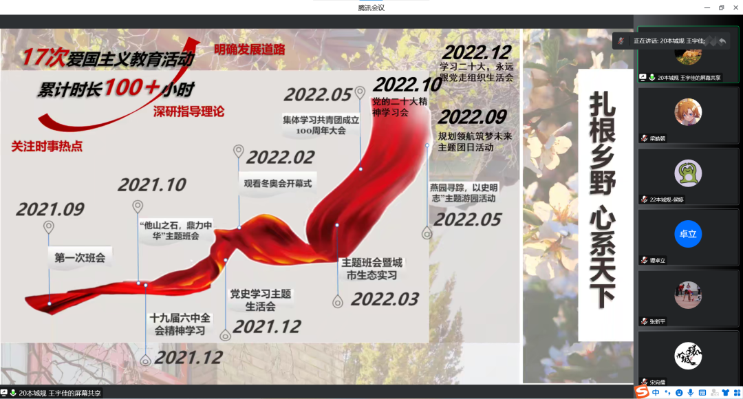 發(fā)布時(shí)間:2022-12-14為了進(jìn)一步提升基層團(tuán)組織規(guī)范化建設(shè)的水平,不斷增強(qiáng)基層團(tuán)支部組織力和凝聚力, 12月14日晚,2022年城市與環(huán)境學(xué)院基層團(tuán)支部述職評(píng)議會(huì)于線上召開。學(xué)院黨委副書記張新平,團(tuán)委書記、學(xué)工辦主任譚卓立,團(tuán)委常務(wù)副書記宋宛儒出席會(huì)議,二十余名來自本、碩、博不同年級(jí)的團(tuán)支部書記與會(huì)。會(huì)議由學(xué)院團(tuán)委組織部侯婷主持。