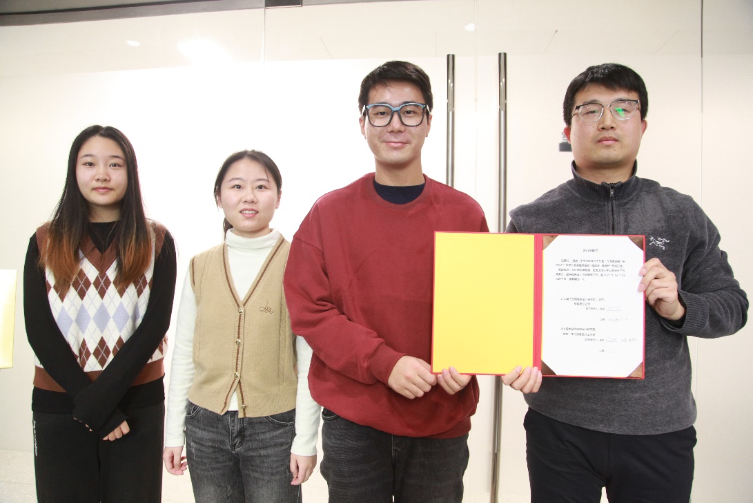 張仁達與工作室設(shè)計師代表陸瑩、劉潤軒、張可欣共同簽署雁翅鎮(zhèn)項目委托書