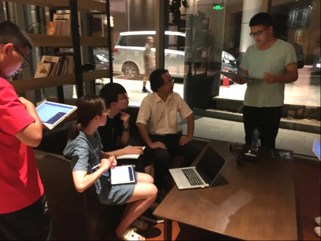 2020年學(xué)院暑期實(shí)踐紹興團(tuán),深夜指導(dǎo)本科生編寫向紹興市文旅集團(tuán)匯報(bào)古城保護(hù)和文旅發(fā)展的報(bào)告(右二)